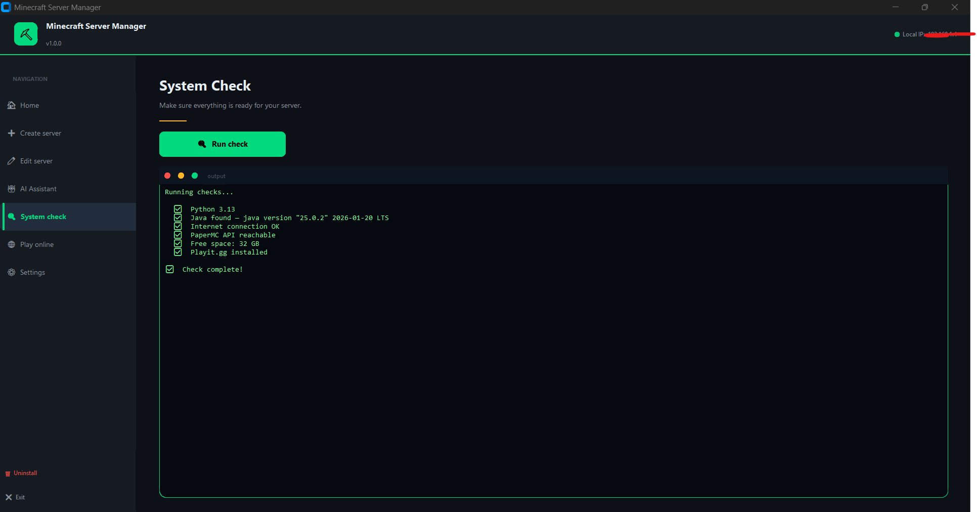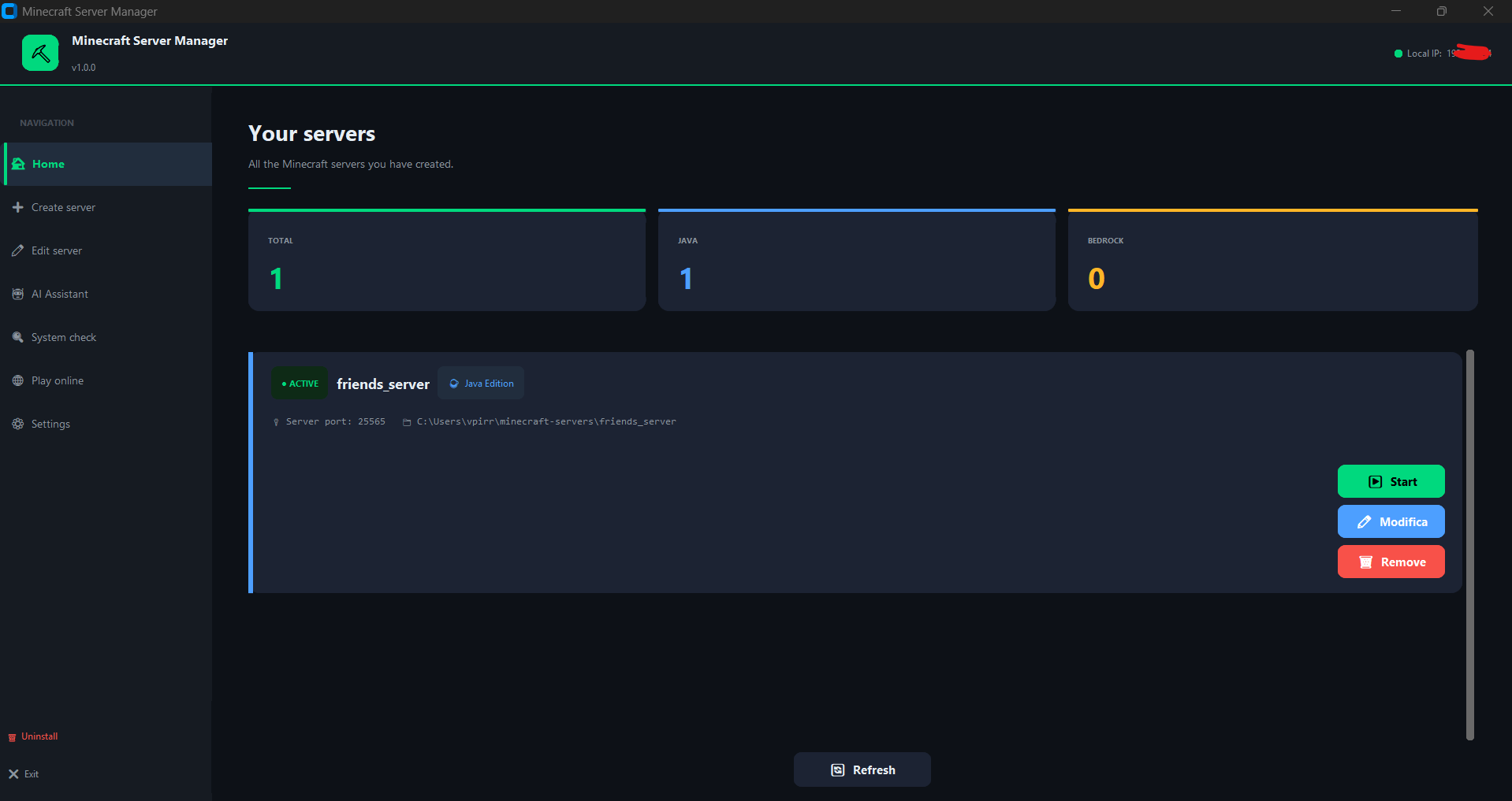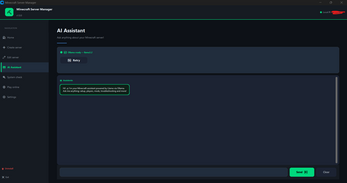 NetherHost takes the complexity out of running a Minecraft server. Whether you want a survival world with friends or a creative build server, NetherHost has you covered. Create Java Edition servers with full mod support or Bedrock servers for cross-platform play. Customize every detail — gamemode, difficulty, world type, PvP, spawn settings and more. Share your server with anyone using the built-in Playit.gg integration, no router configuration needed. Manage installed mods, tweak settings on the fly, and get instant help from the AI assistant powered by Llama running locally on your machine.